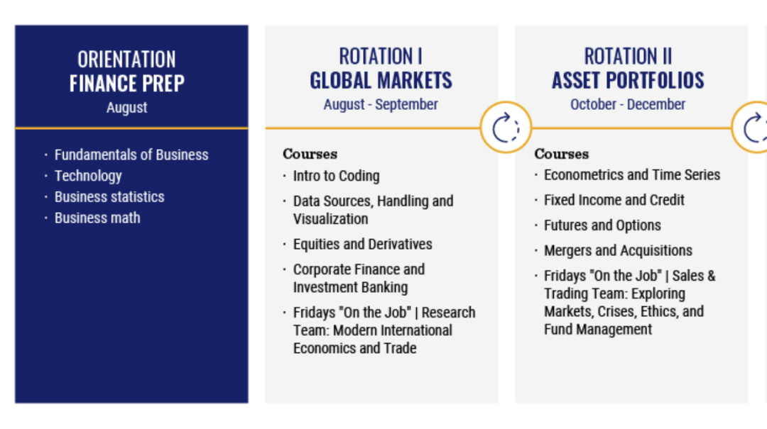 学校表示,这个项目是为了那些想要在sales and trading(销售和交易), investment management(投资管理), FinTech(金融科技), 和 investment banking(投资银行)求职的同学而设立的,会为大家提供很多行业知识(industry know-how),让你拥有独特的沉浸式分析体验(unique analyst immersion)。