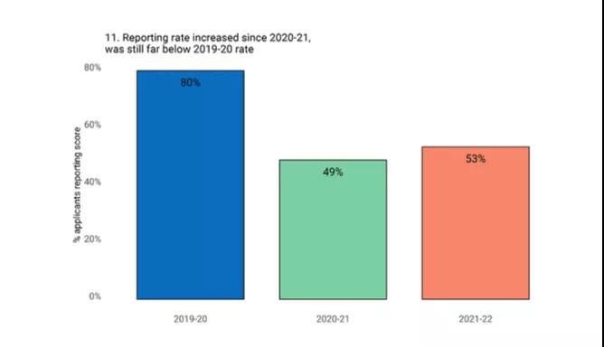 去年有49%的申请者,提交了标化成绩,而今年早申阶段已经上升到了53%。