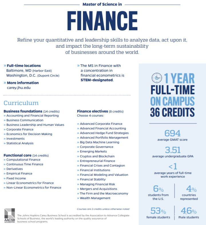 JHU的MSF开设在Carey Business School, 一年制硕士项目,侧重于计算、统计、计量经济技术及其在金融决策中的作用,研究内容包含个股、债券、衍生品、货币等,研究领域涉及资本市场、金融机构、公司金融和公司治理等。