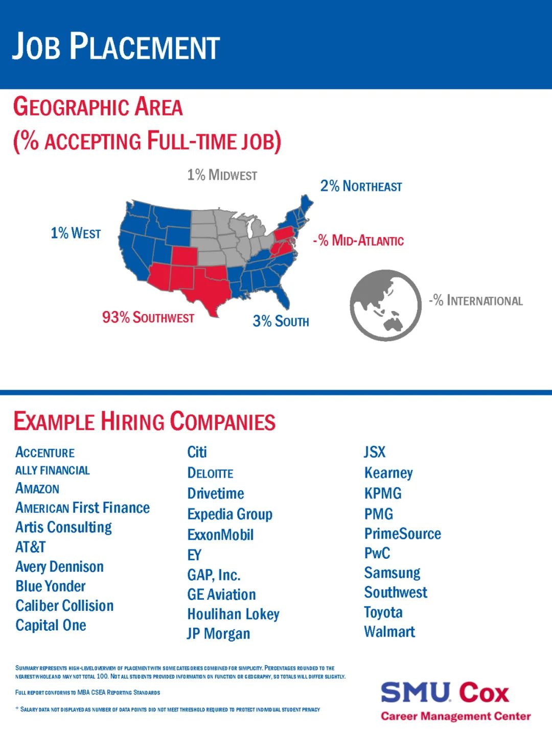 雇主方面,包括银行(花旗、摩根大通),咨询(埃森哲),四大,制造(三星、丰田、GE),零售(沃尔玛、GAP),等等。由于西南地区比较少新兴科技公司,所以雇主里面只有一个亚马逊,看不到Google, Facebook, 苹果、微软等科技巨头身影。