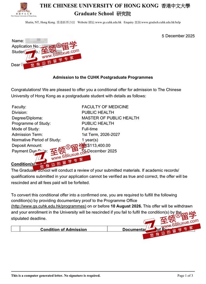 在文书材料准备中,团队重点围绕F同学的实习经历展开,突出其在公共卫生研究中的实践成果与学术潜力,同时通过个人陈述生动传递她对公共卫生专业的热情与长期职业愿景。得益于前期扎实的准备工作,F同学于10月底完成申请提交,12月初顺利获得香港中文大学MPH项目录取,实现了从生物医学到公共卫生领域的成功跨越。