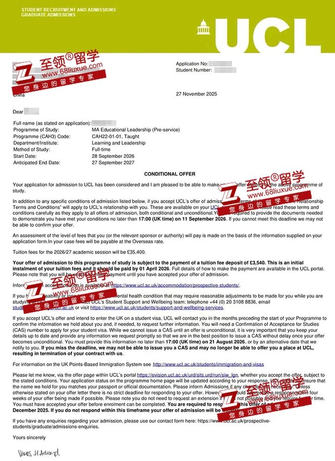 录取结果:伦敦大学学院,教育领导力硕士录取