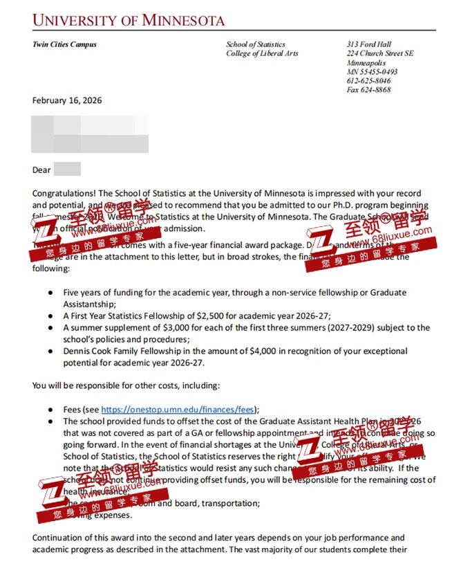 录取结果:明尼苏达大学,统计学PHD全奖+$43,052/年