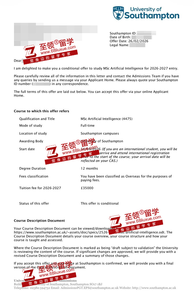 录取结果:MSc Artificial Intelligence 南安普顿大学人工智能硕士录取