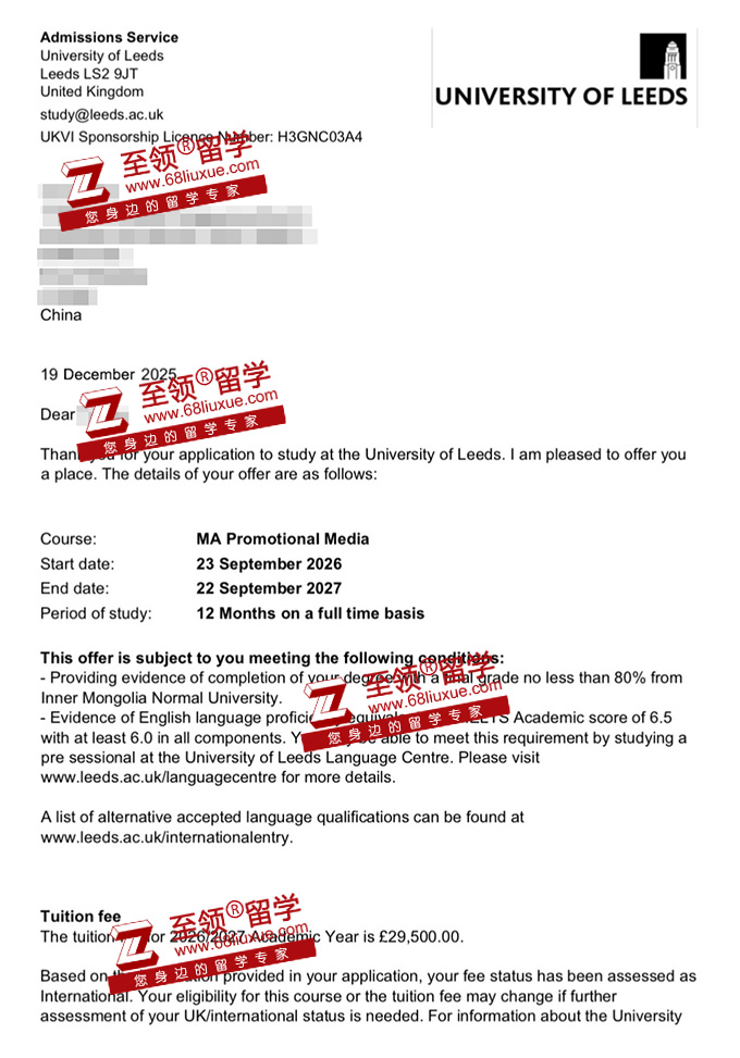 学生在申请团队的指导下,补充了两段相关实习,文书材料中突出广告学专业积累的创意策划、品牌传播等核心能力,将课程模块与职业规划深度绑定,展现"学术-实践-就业"闭环逻辑,与Promotional Media课程中的"数字营销策略”"品牌传播管理"模块高度匹配。在X同学与至领留学团队的密切配合下,学生顺利拿到英国百强名校利兹大学的录取offer。