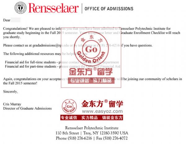 在经过了金东方留学老师们的倾力付出后,S同学很幸运地拿到了伦斯勒理工学院金融工程与风险分析硕士的OFFER。