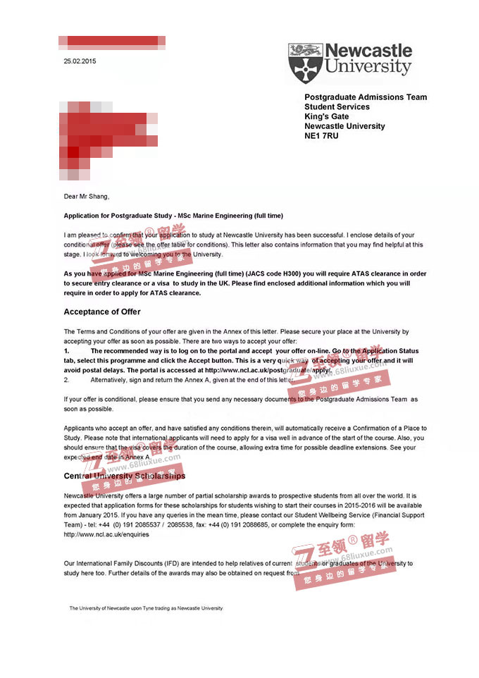 经过至领留学老师和X同学的密切配合,学生收获了纽卡斯尔大学海洋工程硕士录取通知。