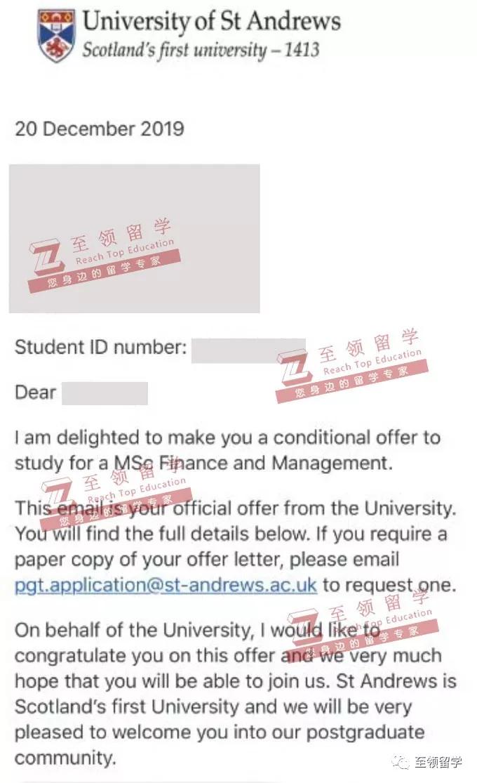 由于L同学很早就准备申请工作,所以我们的老师也在第一时间为她提交了申请资料。申请的过程并不复杂,等结果的日子反而比较煎熬。终于在19年12月下旬等来了圣安德鲁斯大学金融与管理硕士的录取。