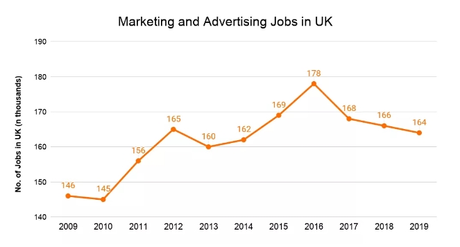 英国的营销和广告工作从2009年的144,000个增加到2019年的171,000个。